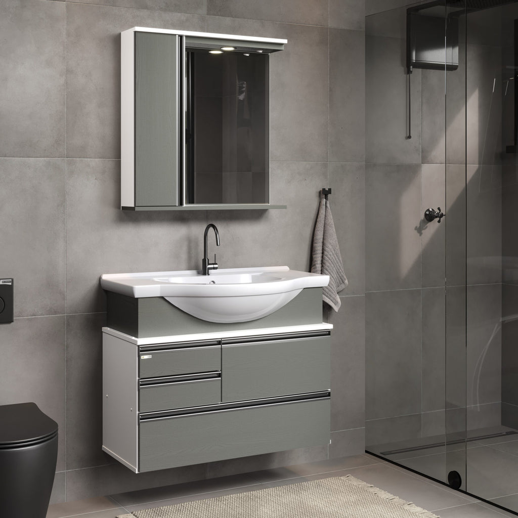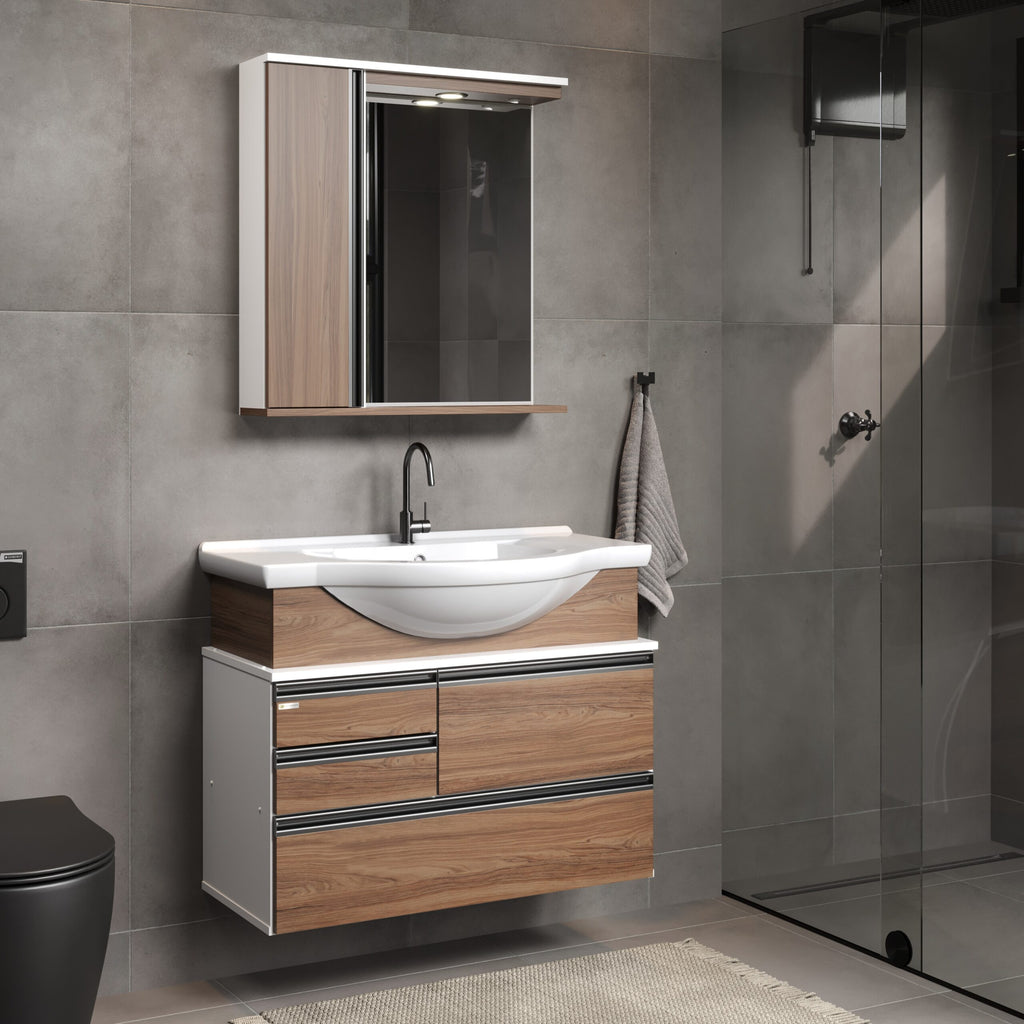 Linha Firenze é inovadora e moderna. Possui estrutura do gabinete, frentes de gavetas, portas e frontão em MDP BP – 15mm madeirado com lâmina melamínico, proporcionando maior resistência à umidade e fácil limpeza, produto de alta qualidade, e durabilidade incomparável. Os puxadores em perfil de alumínio, corrediças e dobradiças em metal reforçado que proporcionam a abertura suave e completa das portas e gavetas, mostram mais um diferencial e praticidade deste produto. Possui pia própria em louça com designer robusto e moderno, onde acompanha válvula do tipo click-up.